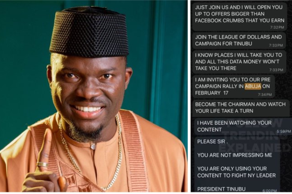 Nigerian skitmaker Kevin Chinedu Arua, popularly known as Governor Amuneke, has said he rejected an offer from the All Progressives Congress (APC) to accept a chairmanship position in exchange for endorsing Bola Ahmed Tinubu and halting his satirical skits critical of the government. In a viral video shared on his X page, the comedian displayed…