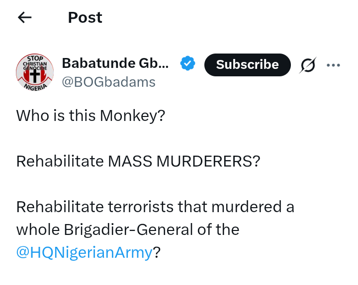 “Who is this Monkey? Rehabilitate Mass murderer? Rehabilitate terrorists that murdered a whole Brigadier-General of the @HQNigerianArmy?