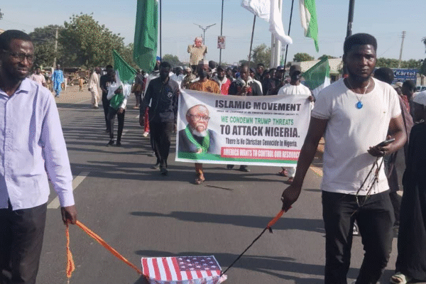 Islamic groups in Kano State are currently protesting against recent moves by United States President, Donald Trump, to intervene in the country’s security crisis. The protesters trooped out on Saturday to counter Trump’s claim of Christian genocide in Nigeria. They were seen displaying placards with different inscriptions such as ‘We condemn Trump’s threat to attack…