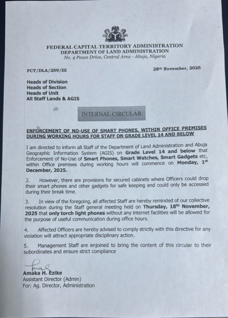 The statement read, “I am directed to inform all Staff of the Department of Land Administration and Abuja Geographic Information System (AGIS) on Grade Level 14 and below that Enforcement of No-Use of Smart Phones, Smart Watches, Smart Gadgets etc, within Office premises during working hours will commence on Monday, 1st December, 2025.