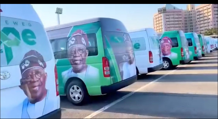 According to the post, the first and third images show brand new buses and sport utility vehicles reportedly designated for Tinubu’s 2027 election campaign.